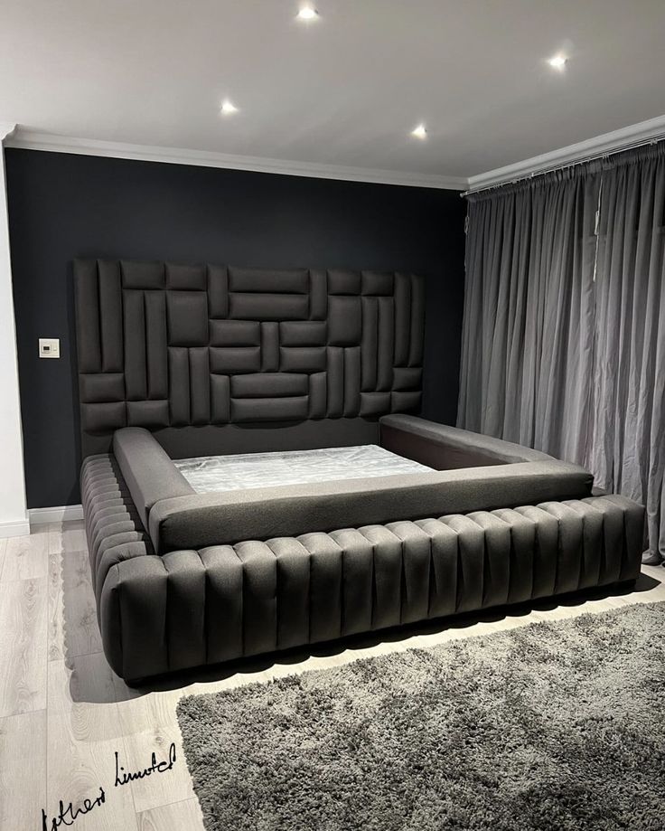 This modern and luxurious bed features a high-quality upholstered design with deep-tone soft fabric and a unique geometric panel pattern. The sturdy frame and wall-height headboard bring a sense of elegance and sophistication to any bedroom, while the wide padded sides and plush base offer both comfort and style.